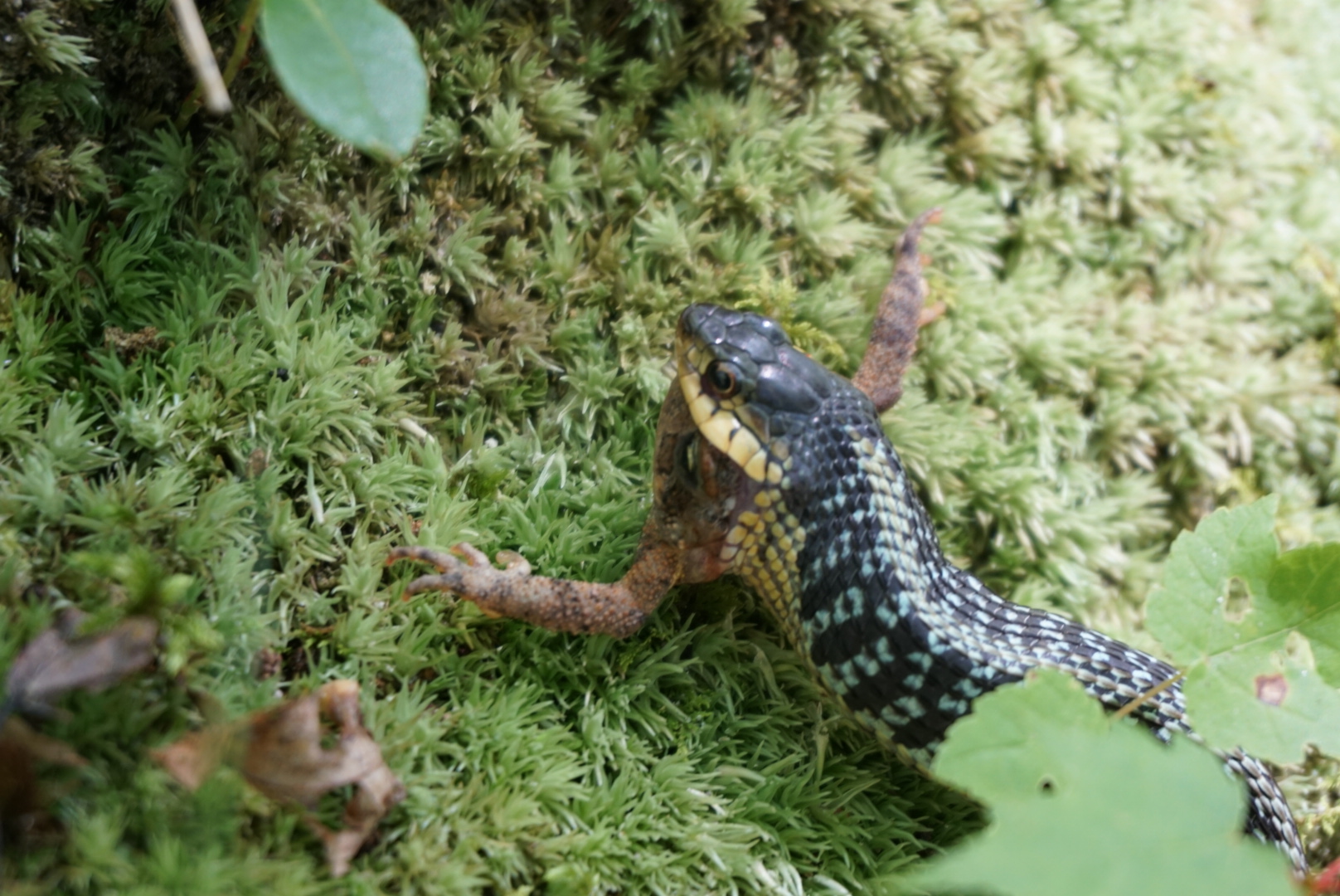 After crossing the suspension bridge, we fumbled through a small mess of side trails and parking lots, until we were sure we had connected with the North Country Trail. This involved a few frustrating wrong turns, but it is hard to get too lost and before long we had it figured out (Pro-tip: Look for blue paint stripes on trees to indicate the proper NCT trail). Officially on the NCT, we began a slow climb towards a ridgeline sufficiently above the Manistee River basin. As a native Washingtonian used to spending time in the Cascades, it was hard to say whether we were atop hills or mountains, but nonetheless it was decent elevation gain for hiking in the Midwest. From the ridge, the trail wound through lush forests where we saw plenty of birds, chipmunks, and monarch butterflies. Around noon, we came across a sizeable garter snake that had just caught a frog in the middle of the trail. Mouth full, the snake tried to make a break for it, but soon gave up on the escape and was forced to take its meal with our cameras in its face.