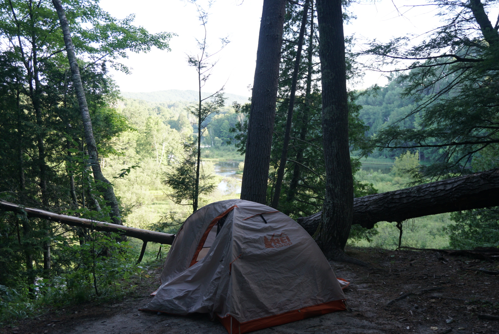 By early evening we had completed our stretch on the NCT and began a steady descent towards the Red River Bridge, a pseudo-halfway point on the journey. Since we had access to facilities and good fishing there, we paused for a couple hours and enjoyed the evening heat. After dinner, some swimming, and fishing, we continued along our way to the nearest wooded campsite. The sun set quickly and the mosquitos came out in force, but before long we came across campsite 10B, a great trailside location perched on a bluff above the river. We made camp with headlamps and bug nets on, then settled in for the night.