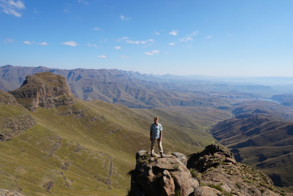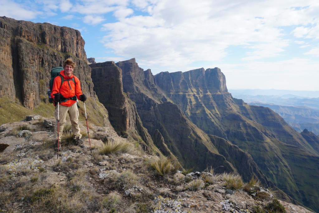 Day four on the Drakensberg was a day of firsts. Notably, it was the first day in which we were hiking according to our original itinerary. This was welcomed, but by no means signalled an easy day ahead. We began our morning by hiking along a thin ridge for about 300m. with a slick rock face on our right and the precipice of the escarpment on the left. It was a nerve-wracking and tedious portion of the trail, as one misstep would clearly result in your demise a couple thousand feet below. On the bright side, the views were incredible from our precarious position.