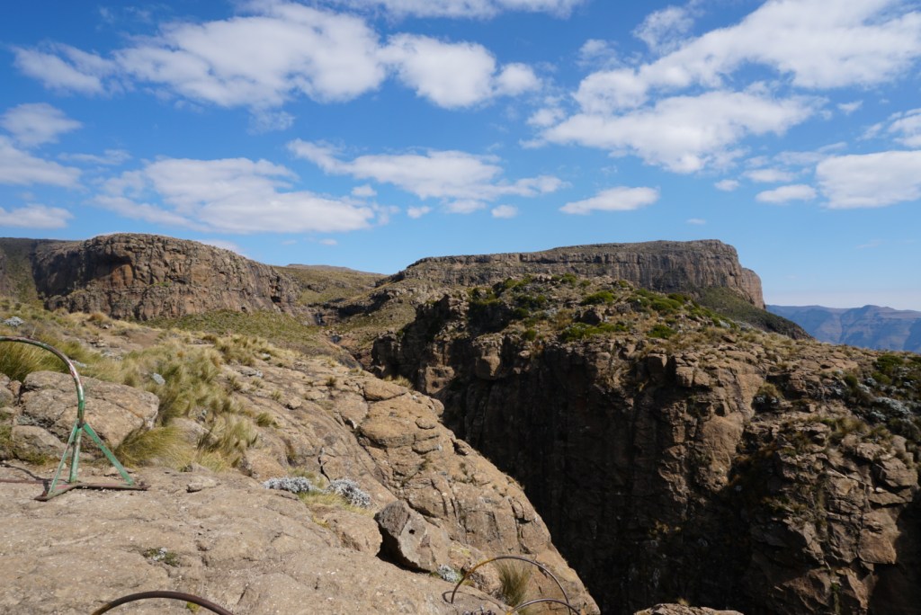 Upon arrival at the park, our frustrations from the evening prior melted away as we stood in the shadow of the grand Sentinel Peak. Filled with anticipation, we paid our park entry fee, and took off for the escarpment. From below, the massive rock formation looked like something out of a fairytale. A natural castle wall, protecting the mysterious kingdom of Lesotho from the wild lands below. After a massive set of switchbacks, we stood at the base of sheer cliff face, with the route’s infamous chain ladder before us. Nervously, we strapped all our gear in tightly and began the lengthy two-part climb to safety at the top of the escarpment. Most of the way up, I was torn between pausing to soak in the experience and just wanting to get myself and my pack to stable ground. Once at the top, we paused to acknowledge the insanity of the experience and to gaze out at the incredible view from the escarpment. We were in a new world, a rocky scrubland seemingly miles above the rolling green hills below.
