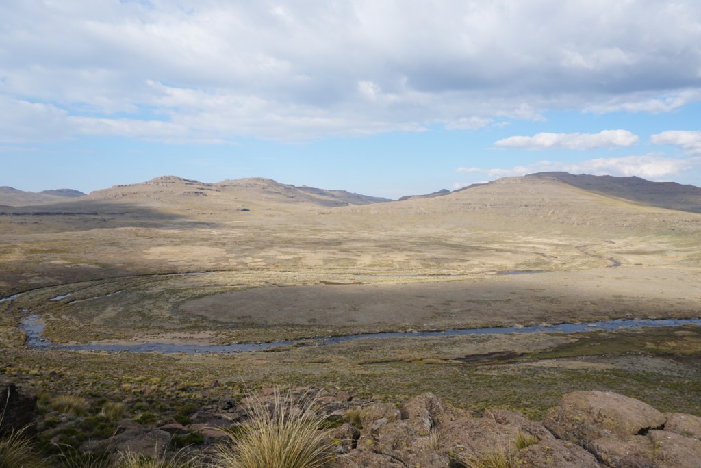 As the day drew on and our bodies warmed up, we started to better appreciate the scenery around us. For miles, all we could see were beautifully pristine rolling grasslands. When the sun finally breached the smooth peaks to the east, the plateau was bathed in a soft light that highlighted the thin blue streams cutting across the terrain. Eventually, the temperature rose to a point that we felt comfortable shedding our layers. By 11:30am, we reached Rat Hole. This validated our decision to stop short the night before. Even from our vantage point at the top of a hill, the waymarked cave that we were supposed to sleep in was nowhere to be seen.