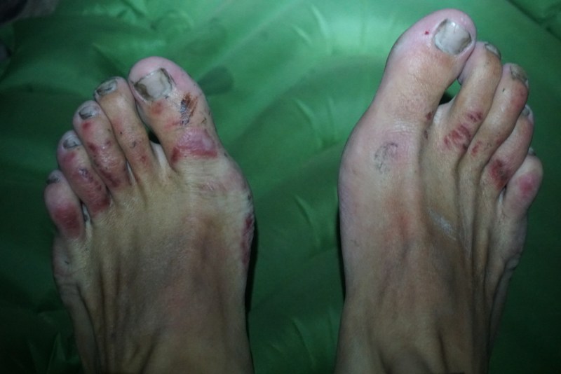 We awoke on day five both refreshed, as a result of our great evening the night before, and with a little sense of dread. They day would start and finish with two ascents, each over 1,500ft. To make matters a little worse, my feet had become infected as a result of the damp conditions. The night before, in an attempt to cope with the intense cold, I made the mistake of putting socks on at night while my feet were still damp from fording small rivers. I went to sleep with standard blisters on my toes, but woke up with a bloody infection that had spread to the arches of my feet as well. From this point on, I made a point to air them out whenever possible.