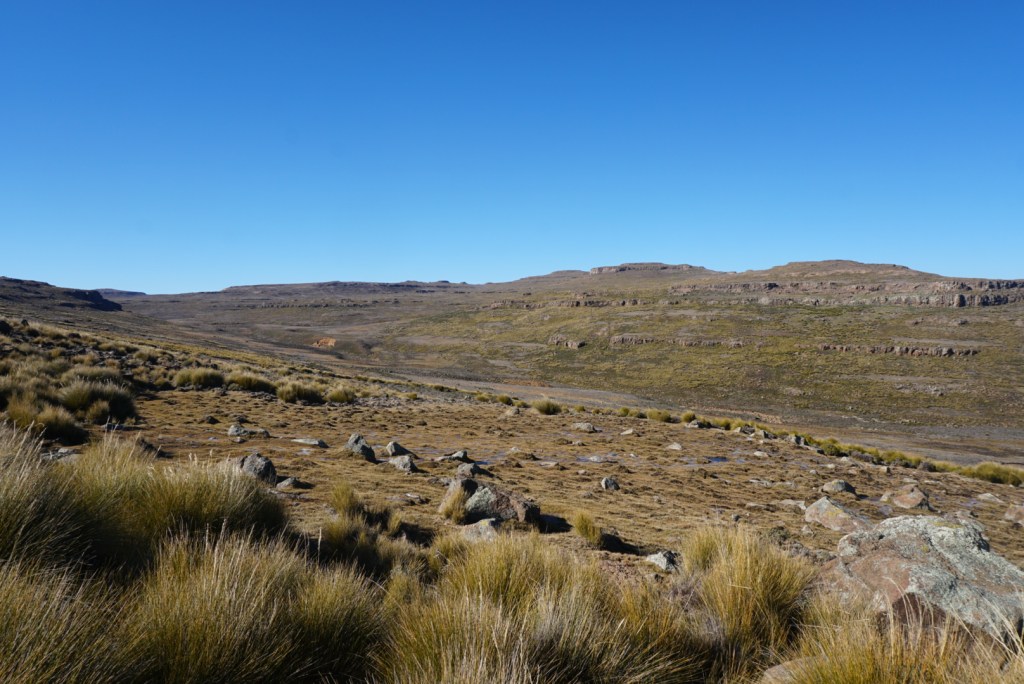 The days hiking began with a quick climb out of our idyllic little valley. When we reached the saddle of the ridge we were crossing, we could see Highway A14 in the distance, our first true sign of civilization since the faraway diamond mine we spotted a week or so ago. We came down a steep hill that turned out to be more treacherous than expected, and then commenced a long, flat walk along the highway to Sani Pass.