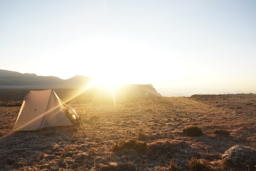 After Rat Hole, we didn’t stop again until we reached the edge of the escarpment. There we sat for a long lunch while taking in expansive views of the South African wilderness below. The second half of our day was a relative blur. Post lunch, we made our best attempt to get back on schedule by pushing as quickly was possible. This goal was hindered by the relative instability of the terrain however. Over time, the rocks and lumpy scrub brush blanketing the floor took a toll on our ankles and lessened our pace. Approximately two miles from our intended campsite we decided to call it a day. Dusk was fast approaching, and we had just found the first instance of suitable terrain that we’d seen for miles. After quickly pitching my tent, I wandered to the top of a nearby hill where I could sit and take in an ethereal sunset. The sun disappears so fast in Lesotho, but not before briefly illuminating the entire cloudscape in a vibrant mix of red and orange tones.