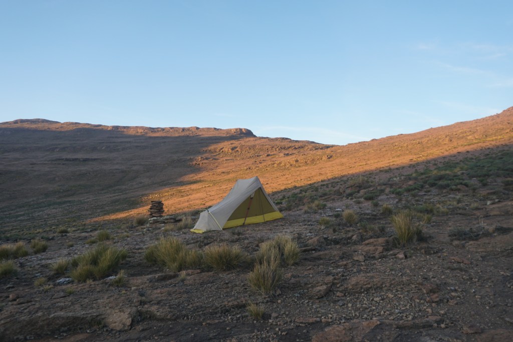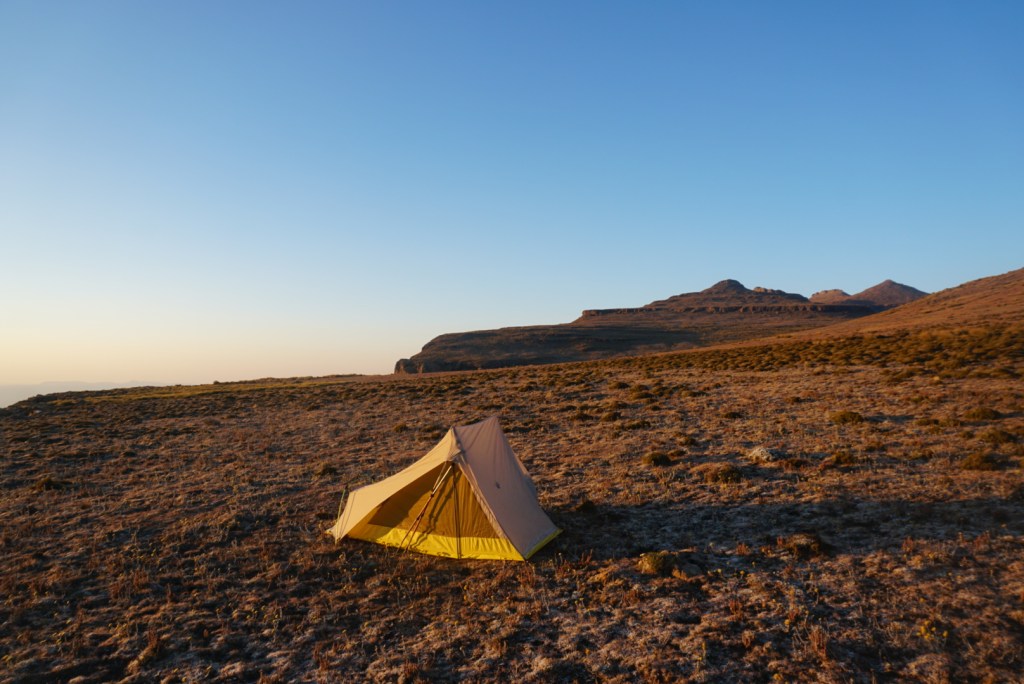 Despite the name Mzimude Cave, we didn’t locate the small cave burrowed into the edge of the escarpment until we were already pitched and 400ft. above it in elevation. Regardless, we were happy with our spot which offered more fantastic views of the land below. As night fell, we could see a cluster of twinkling lights below that we speculated were from Bushman’s Nek. Being able to see the finish line only elevated our excitement. I knew I would miss the rugged beauty of Lesotho dearly, but proper food, company, and a shower were calling.
