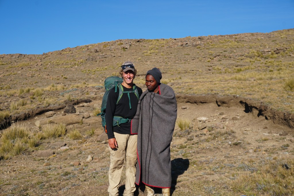 We stopped for lunch atop a prominent ridge and ate slowly while admiring the panoramic views. As we were enjoying ourselves and only had three miles left, we debated passing most of the day there, but eventually some strong winds forced us to move on. About a mile or so into the final push, we came across a lone herdsman who greeted us with a very friendly hello as he passed by. As Ben had given up on his oatmeal, he decided to offer it to the young boy. As we caught up to him and passed off the food, we learned that he spoke some elementary English. It turned out he was the youngest boy in his family and had the privilege of attending school in Maseru for a few years. After his brother died however, he was forced to drop out and take responsibility for the sheep herd in the south. Life sounded tough on the plateau. He mentioned constantly having to protect the herd from jackals, and told us a story about having some sheep stolen by other herdsmen who shot rifles at his hut to keep him scared and inside. It was fascinating.