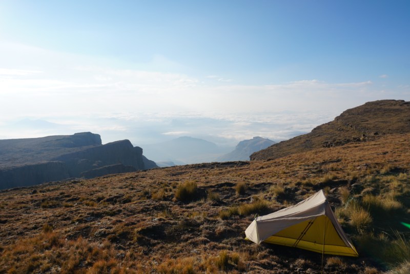 Though our second to last night felt warmer than usual, I still woke to a frost lining on both the inside and outside of my tent. As I stood shaking it out, I joked with Ben about whether it was actually getting warmer or if we had just frozen all of our nerve endings off over the past two weeks. Spirits were very high as we commenced our final full day in the beautiful, but trying Drakensberg mountains. In true DGT fashion, it would be a tough day of walking.