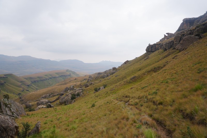 As expected, the Drakensberg Grand Traverse forced us to earn our way out of Lesotho. After a mini-climb out of our secret valley, we were faced with a harrowingly steep and unstable trek down a hillside and into a cramped valley that would show us out of the mountains. Despite a couple stumbles, we eventually made it, and began a more level walk along a river. This continued for a few miles. Despite carefully tracking our GPS, we were certain that every time we finished working around the base of a prominent hill, it would be our last. Each time our hopes were dashed as another came into view. Finally, we reached a large clearing, where our GPS indicated a sharp left turn, and escorted us to the rim of the escarpment. We paused a minute to take in the bittersweet moment, then plunged over the edge and down a narrow hillside sheep trail.