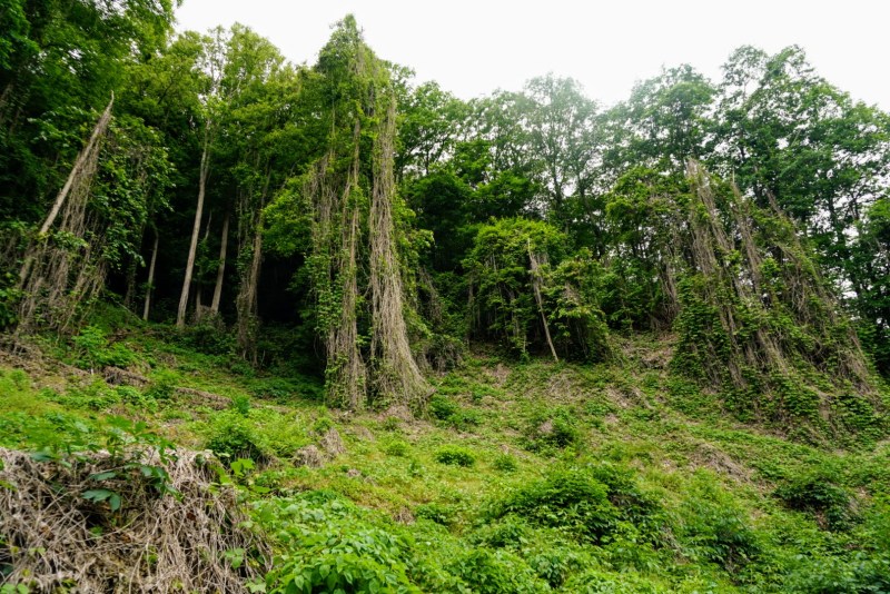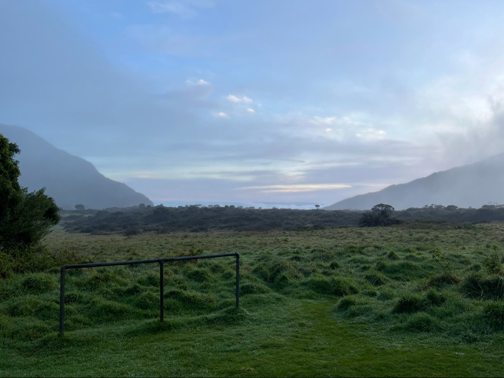 Eventually, we bid farewell to our Nene friends and continued on our journey into the late afternoon. It wasn’t long before we encountered another goose, this one standing right in the middle of our path. He was considerably less friendly than the mating pair and refused to yield even as we patiently waited for the right of way. After a few minutes, we nervously shooed him off trail and continued on towards the Kaupo Gap. After rounding a sizeable cinder cone and making a small descent, we arrived in the gap. It was like a scene out of Jurassic Park. Tucked in amongst imposing, sheer cliffs was a small cabin surrounded by lush foliage. A thick grove of trees hugged the wall and crowded into small ravines as far up the escarpment as they could reach. A thin layer of fog hung in the valley, creating a spooky effect as the sun dipped below the walls of the caldera. We set up our tents then poked around a bit and chatted with our neighbors staying in the cabin. While conversing, a family of six Nene waddled out of the tall grass and began feasting on the green shrubs along the trail.