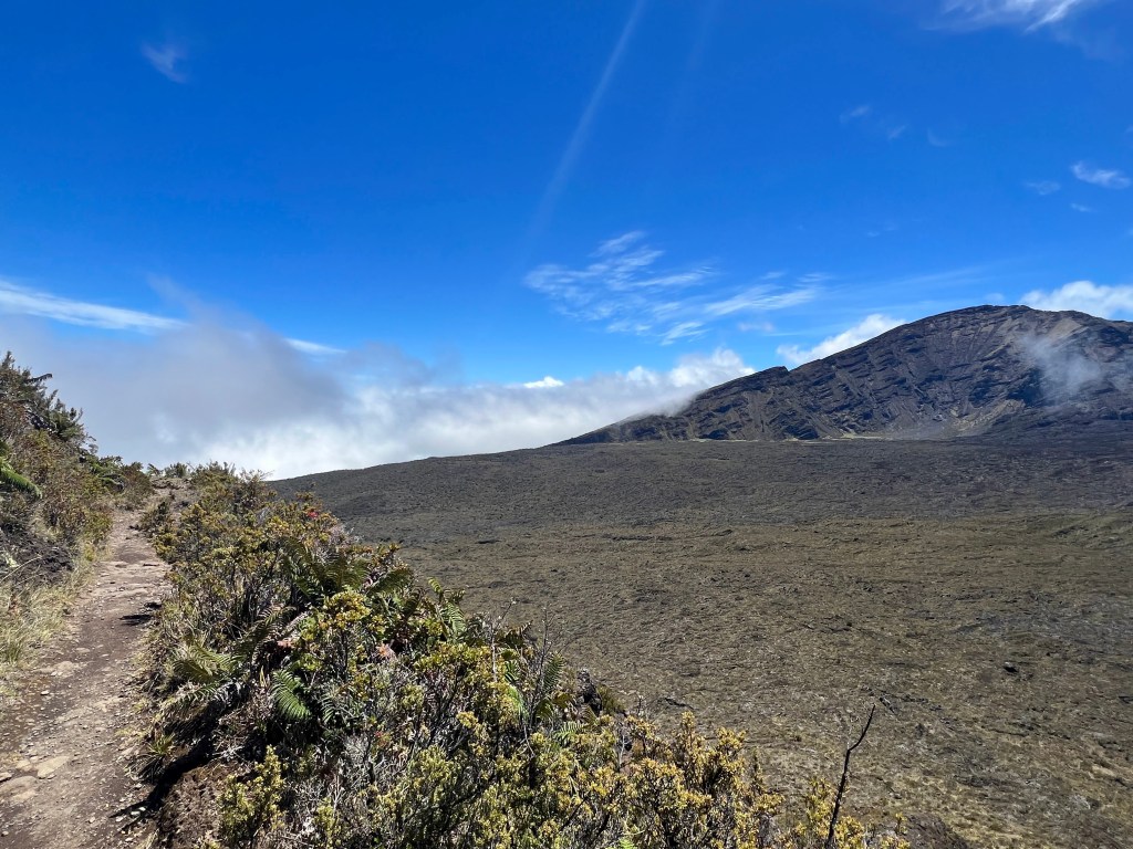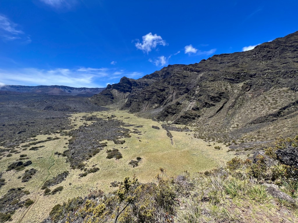 With a little boost of adrenaline to wake us up, we retraced our steps around the O’ilipu’u cinder cone and back to the green covered lava fields. The terrain in this section was particularly rough, and while carefully watching our feet to avoid a tumble onto the sharp rock, we almost forgot to look back behind us. When we did, we were amazed by what we had seen. The morning fog had retreated, and now the clouds hung at the top of the escarpment. Periodically, a gust of wind would spill the white mist over the edge of the cliffs and into the crater, where it would quickly dissipate into nothing. The blue skies also provided a clear view through the Kaupo Gap, across the Pacific Ocean, and all the way to Mauna Kea on the Island of Hawaii approximately 100 miles away. It was a sight to behold.
